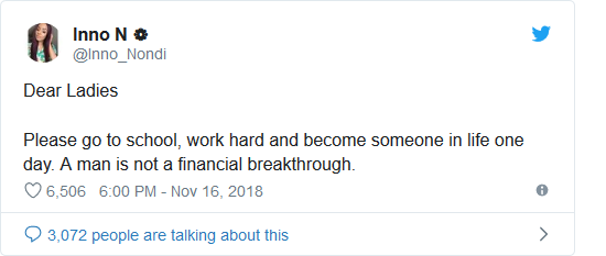 “Dear Ladies Please go to school, work hard and become someone in life one day. A man is not a financial breakthrough”.