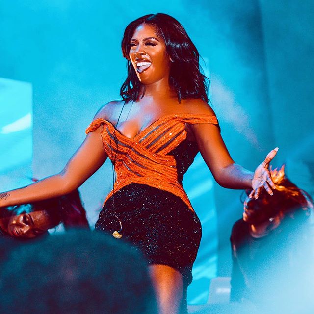 Tiwa Savage shares cute photos as she bares cleavage during a performance on stage.