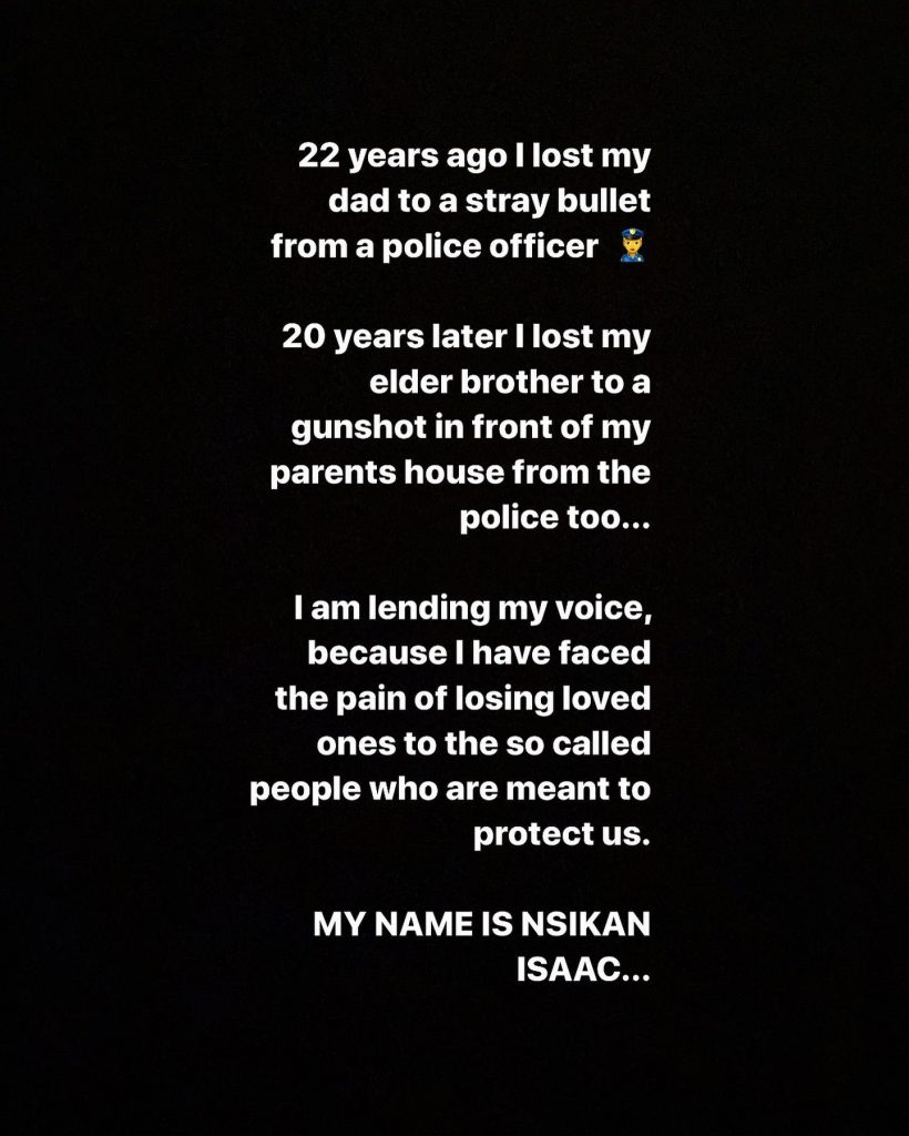 The 31-year-old shared her story on her Instagram page saying, “22 years ago I lost my dad to a stray bullet from a police officer, 20 years later I lost my elder brother to a gunshot in front of my parents’ house from the police too.”