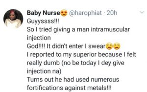 A nurse took to social media to narrate her encounter with a patient whose skin could not be penetrated with a needle.