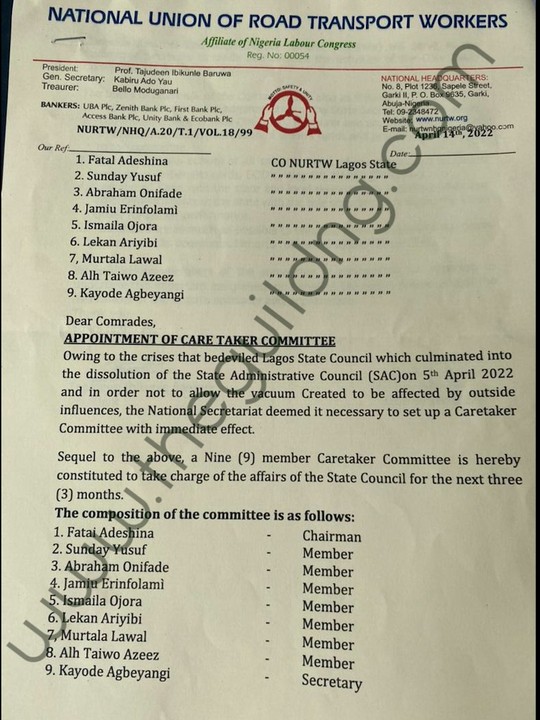 “The nine-man caretaker committee will be led by Mr Fatai Adeshina, a stakeholder in the transportation sector, and the committee will operate for next three months as stipulated in the union’s constitution.