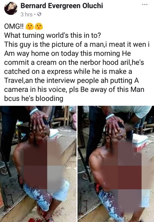 A Facebook user identified as Bernard Evergreen Oluchi, who is a serving female member of the National Youth Service Corps (NYSC), has turned an internet sensation after she took to the social media platform to share the story of a man who was beaten for committing a crime. She posted photos of the victim of jungle justice who was caught in crime, and wrote: “OMG! What turning world’s this in to?“This guy is the picture of a man, i meat it wen i Am way home on today this morning He commit a cream on the nerbor hood aril, he’s catched on a express while he is make a Travel, an the interview people ah putting A camera in his voice, pls Be away of this Man bcus he’s blooding.”