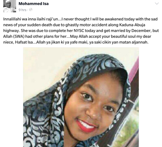 A serving youth corps member, Hafsat Isa, who was due to complete her service and get married in December this year, died in a fatal accident along the Kaduna-Abuja expressway. Her uncle, Mohammed Isa, took to his Facebook page to mourn her.