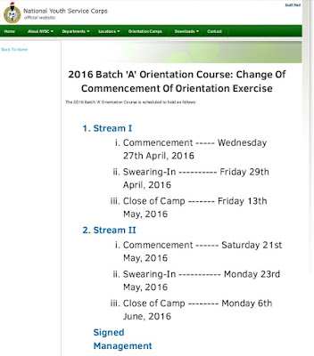 The date for the commencement of the 2016 Batch ‘A’ Orientation Course has been changed as indicated above by NYSC. This was announced on their official website.