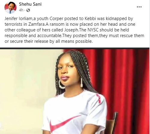 ”Jenifer Iorliam,a youth Corper posted to Kebbi was kidnapped by terrorists in Zamfara. A ransom is now placed on her head and one other colleague of hers called Joseph.The NYSC should be held responsible and accountable.They posted them,they must rescue them or secure their release by all means possible.”