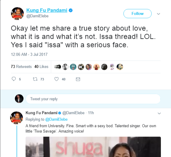 Popular Beat 99.9 FM OAP, Dami Elebe in a twitter thread today told a story of how a friend of hers was impregnated and infected with HIV by a guy who eventually dumped her and married someone else.