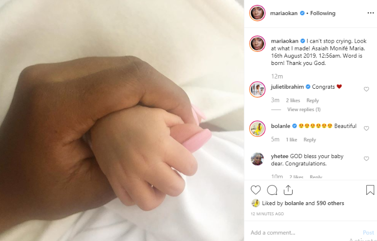 Former Beats FM OAP, Maria Okan has confirmed welcoming a baby girl. The baby girl christened Asaiah Monifé Maria, was welcomed by 12:56am on August 16.