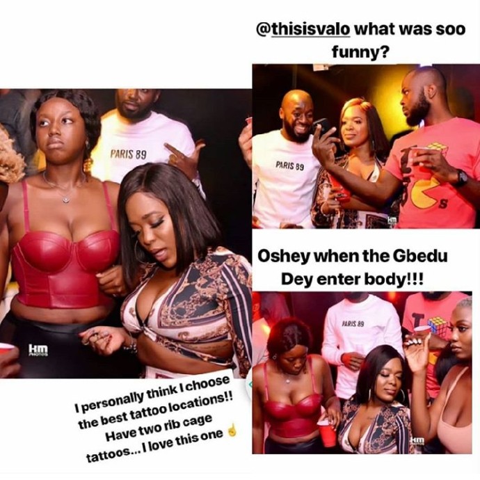 Nigerian radio goddess, Moet Abebe steps put looking gorgeous in a mini wrap dress leaving her cleavages bare just like those of her female friends who both stormed the party venue in cleavage popping rigs.