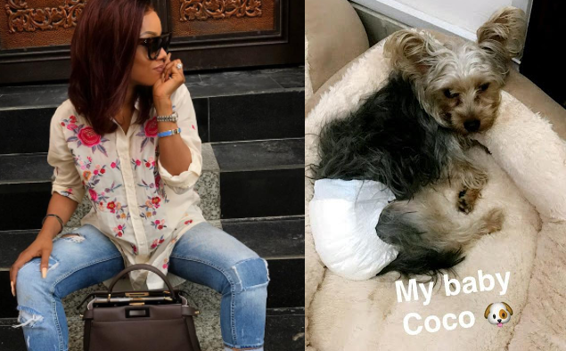 Toke Makinwa shared a photo of her dog coco wearing diapers.She explained the dog is on her period and keeps staining the whole house..