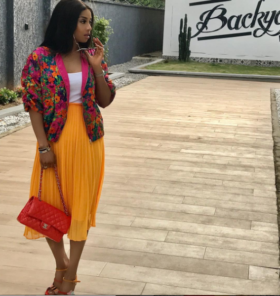 While it is very easy to look like a clown in colour blocking outfits, media personality and style star, Toke Makinwa pulled it off and looked gorgeous in a clash of colours .She paired her outfit with a Chanelbag and Fendi shoes.