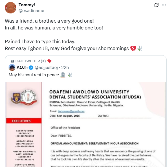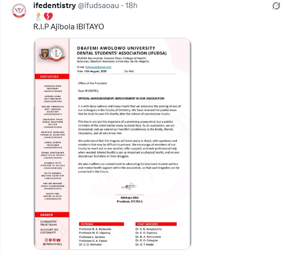 The President of the Dentistry Students’ Association, Adebayo Idris, who confirmed the incident in a statement on Wednesday, August 13, 2025 said the tragedy occurred shortly after the examination results were released on August 12.