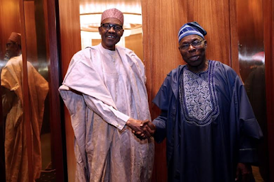 Obasanjo with President Buhari after their closed door meeting today (photos)