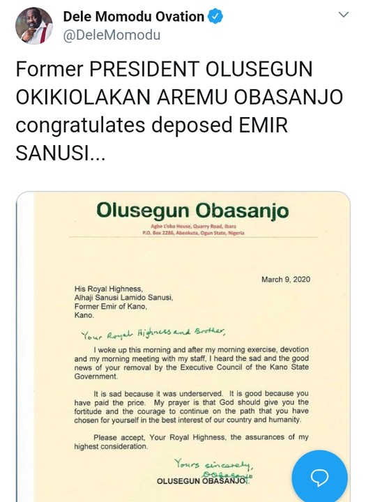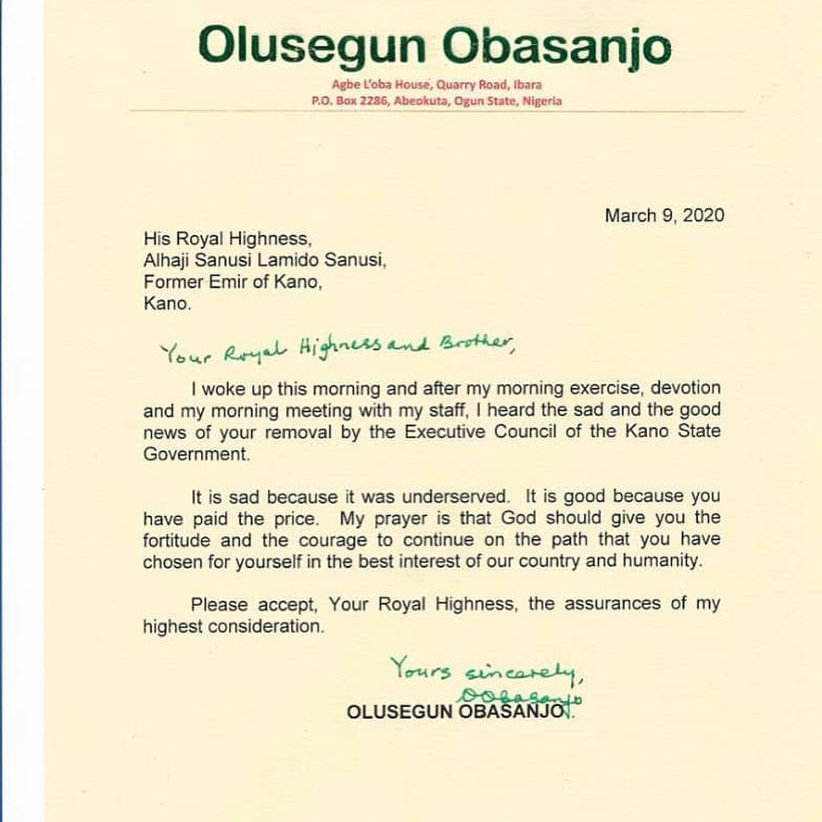 I woke up this morning and after my morning exercise, devotion and my morning meeting with my staff, I heard the sad and the good news of your removal by the Executive Council of the Kano State Government.