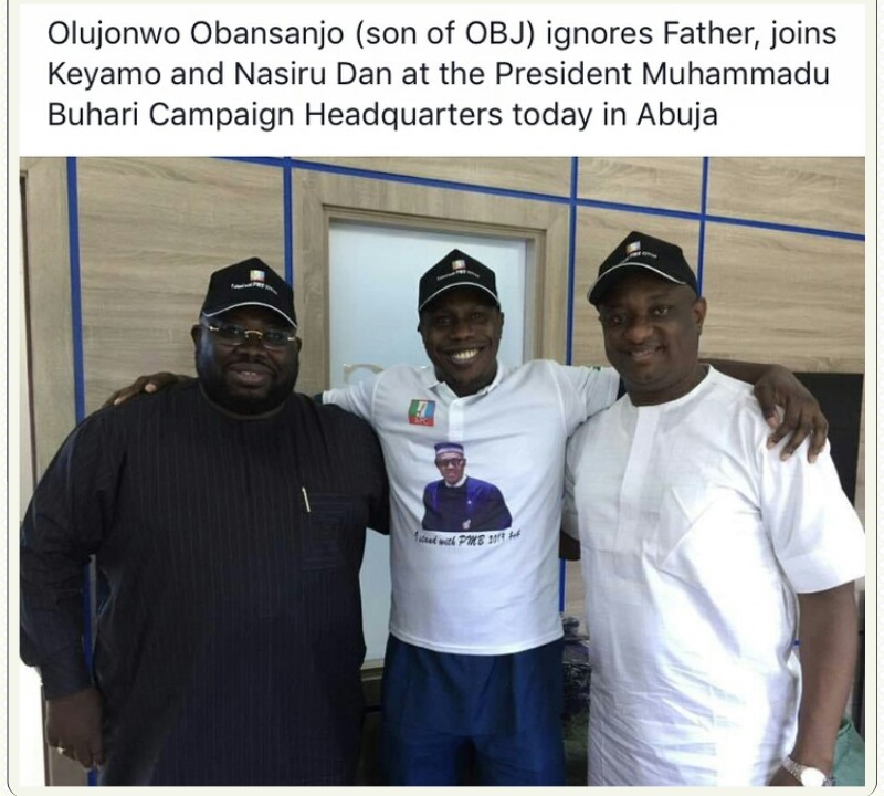 “Obasanjo Joins Buhari’s Campaign Team: From Left – Alhaji Nasiru Danu (The Dan Amarna of Dutse & Director of Logistics, PMB Campaign Organisation), Olujonwo Obansanjo (son of OBJ) and my humble self as we officially received OBJ’s son at d PMB Campaign Headquarters today in Abuja,” he wrote.