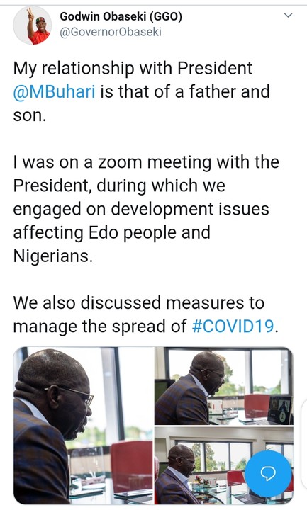 I was on a zoom meeting with the President, during which we engaged on development issues affecting Edo people and Nigerians.