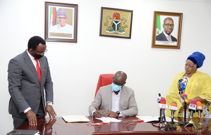 Edo State Governor, Mr. Godwin Obaseki (middle) signing the Revised 2020 Appropriation Bill into Law. The governor is flanked by the Speaker, Edo State House of Assembly, Rt. Hon. Frank Okiye (left), and the Commissioner for Budget and Economic Planning, Hon. Momoh Oise Omorogbe, at Government House, Benin City, on Wednesday, July 29, 2020.