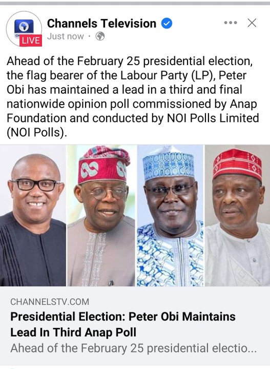 Ahead of the February 25 presidential election, the flag bearer of the Labour Party (LP), Peter Obi has maintained a lead in a third and final nationwide opinion poll commissioned by Anap Foundation and conducted by NOI Polls Limited (NOIPolls).