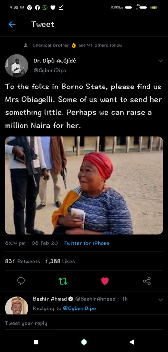 To the folks in Borno State, please find us Mrs Obiagelli. Some of us want to send her something little. Perhaps we can raise a million Naira for her.