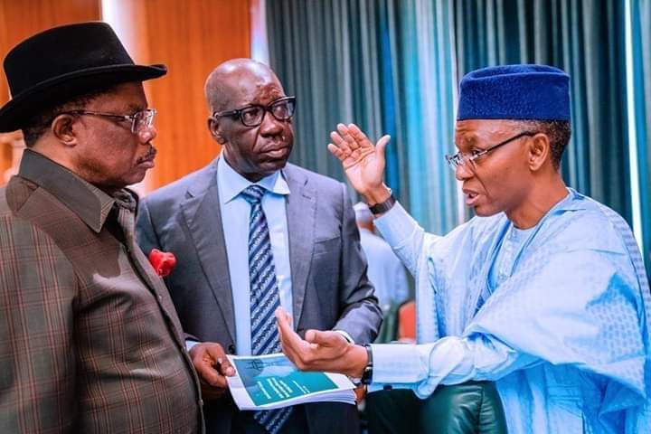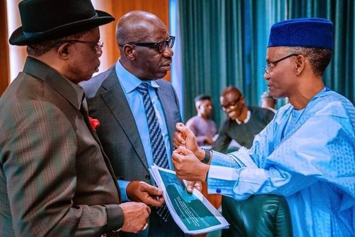 The Anambra State Governor, Dr Willie Obiano, Gov of Edo State Godwin Obaseki and Gov of Kaduna state El Rufai on Thursday, March 19, 2020, at the National Economic Council (NEC) meeting held at the State House, in Abuja.