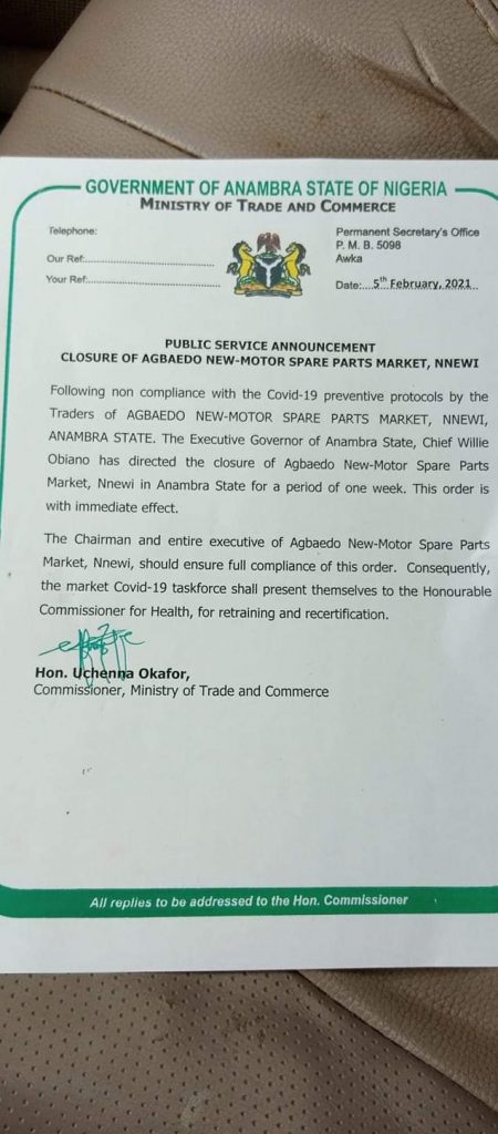 Part of the release read, “Following the non-compliance to the COVID-19 safety protocols by the Agbaedo new motor spare parts market, Nnewi, His Excellency the executive governor of Anambra State, Chief Willie Obiano has ordered for the closure of the market.”
