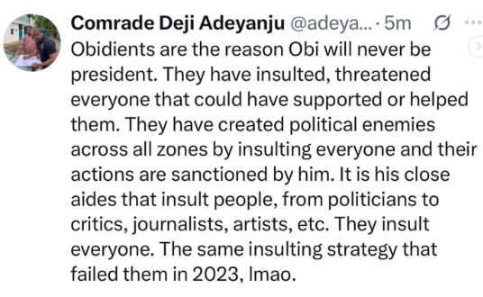 In a post shared on his X handle this afternoon, Deji said the Obidients have over the years formed the habit of insulting and threatening everyone and anyone and this ‘’strategy” led to his failure in the last election.