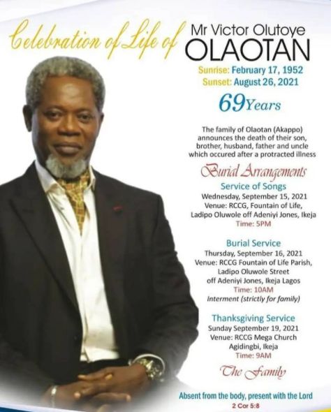 According to the obituary, Sighted By NaijaCover, A service of songs will hold at the RCCG, Fountain of Life parish in Ikeja, Lagos state on Wednesday, September 15 while his remains will be interred on Friday, September 16.