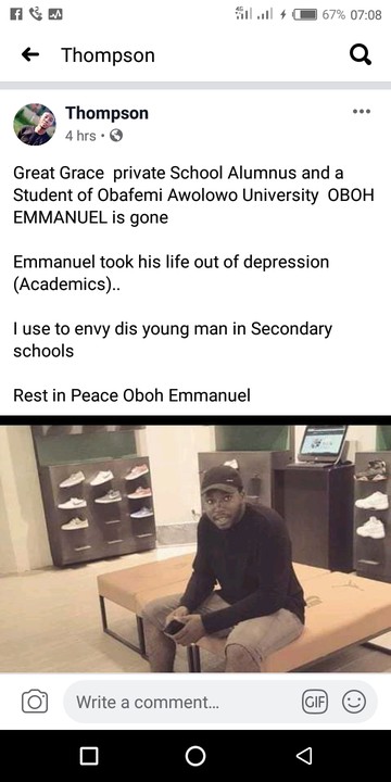 Great Grace private School Alumnus and a Student of Obafemi Awolowo University OBOH EMMANUEL is gone