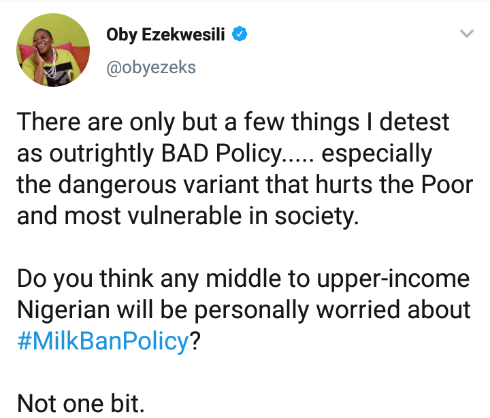 “Well, take my advice. You will only DROP more millions of Nigerians into Poverty with #MilkBanPolicy!” the former education minister said.