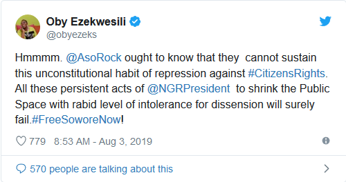 Oby Ezekwesili has reacted to the report of operatives of the Department of State Services (DSS) allegedly arresting the former Presidential candiate of the African Action Congress (AAC) Omoyele Sowore, over a planned protest on August 5.