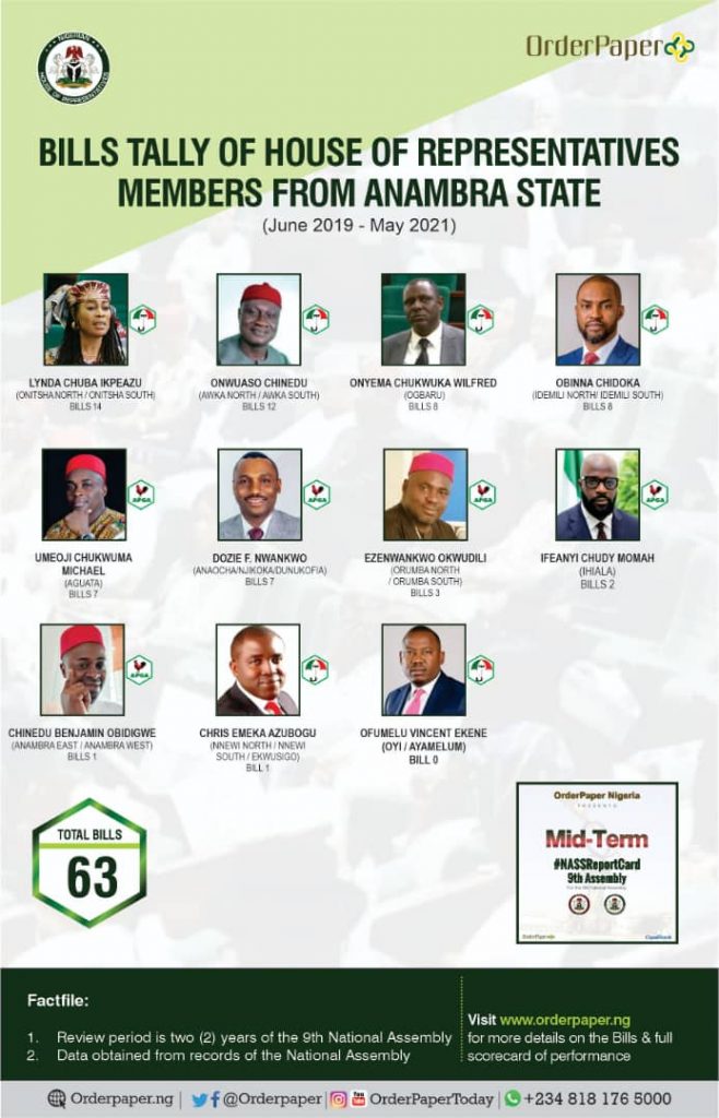 However, Ayika Valentine Ogbonna (Njikoka/Dunukofia/Anaocha) and Ofumelu Vincent Ekene (Oyi/Ayamelum) have not sponsored any bill since their assumption of duty at 9th Assembly.