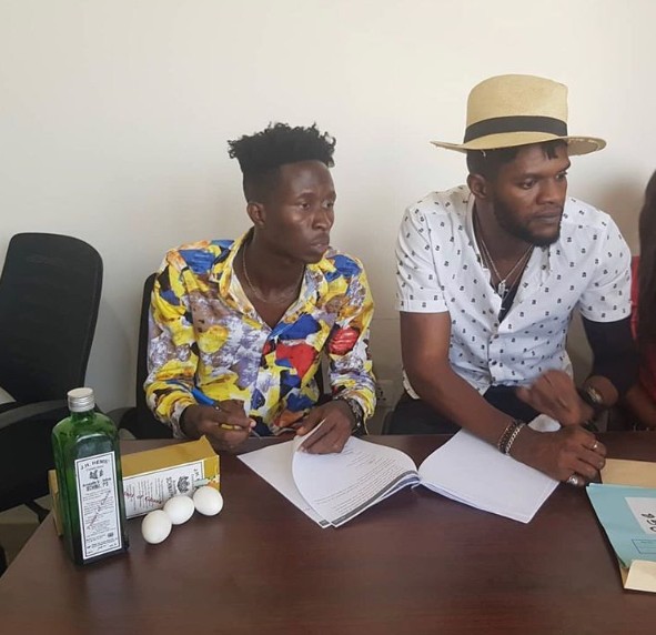A Ghanaian man, Ogidi Brown, who is the CEO of OGB, has signed a new artiste named Cryme after his dispute with his former artiste, Fameye.During the signing, Brown brought schnapps and eggs to the contract as a sign of warning just in case the artiste also wants to be ungrateful.It was gathered that Fameye turned his back on the label after he got his breakthrough hit single