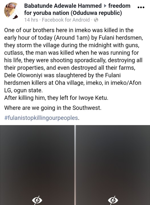 One of our brothers here in imeko was killed in the early hour of today (Around 1am) by Fulani herdsmen, they storm the village during the midnight with guns, cutlass, the man was killed when he was running for his life, they were shooting sporadically, destroying all their properties, and even destroyed all their farms, Dele Olowoniyi was slaughtered by the Fulani herdsmen killers at Oha village, imeko, in imeko/Afon LG, ogun state.