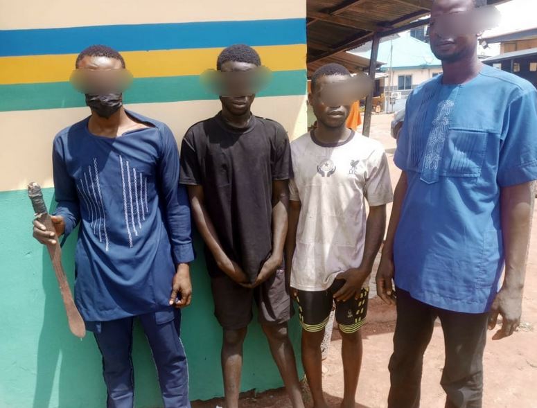 The suspects identified as Sherrif Kamoru 28, Rabiu Seyidu 37, Opeyemi Adebayo 26 and Ajibola Fakolade 21, were arrested following a report lodged at Sango divisional headquarters on the 20th of March 2023 by one Adeleye Sunday, who reported that he was attacked by some armed hoodlums at about 5:30 am at Joju area of Sango ota. He stated further that the hoodlums dispossessed him of his two phones after inflicting machete cut on his neck.