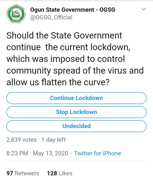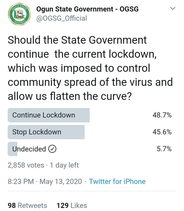 Ogun state government conducts online poll on whether the state should continue with the lockdown.