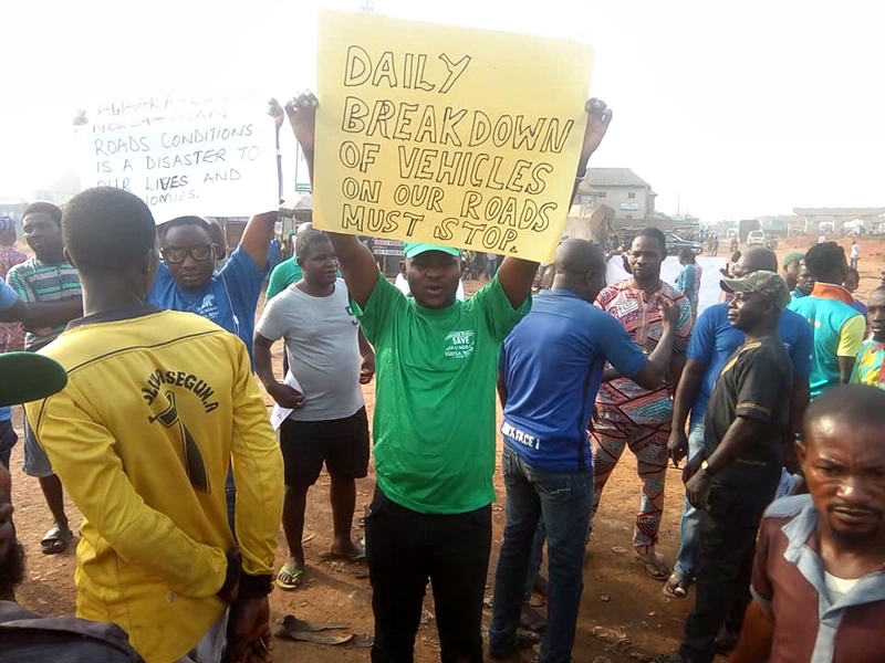 The protesters who converged at the abandoned Lusada Bridge area of the road displayed placards with inscriptions expressing disappointment with Federal Government handling of the road.