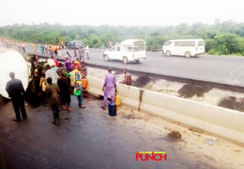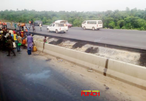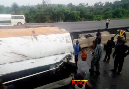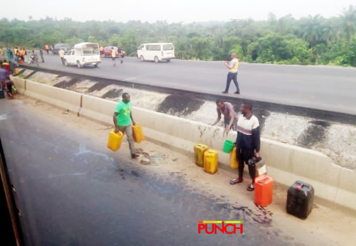 Some persons suspected to be residents of Sapade, a community along the Ogun State end of the Lagos-Ibadan Expressway, have been seen scooping fuel from a fallen tanker on Sunday. According to a report by Punch, the fuel tanker had fallen in Sapade area on Saturday. See the photographs, by Olatunji Obasa:
