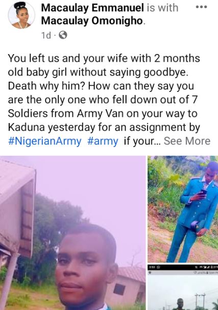 “You left us and your wife with 2 months old baby girl without saying goodbye. Death why him? How can they say you are the only one who fell down out of 7 Soldiers from Army Van on your way to Kaduna yesterday for an assignment by #NigerianArmy #army” Emmanuel wrote.