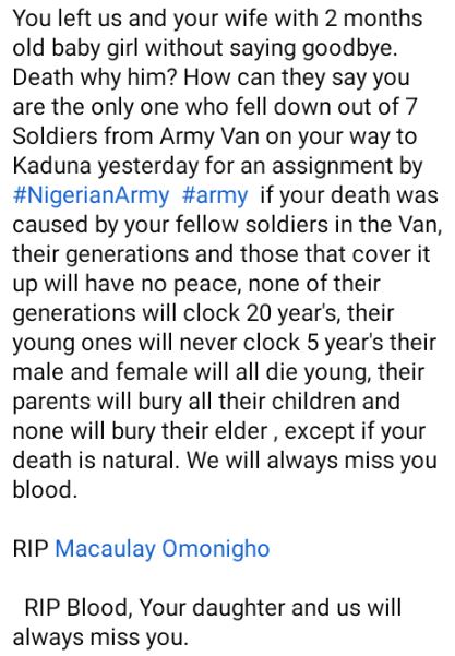 “If your death was caused by your fellow soldiers in the Van, their generations and those that cover it up will have no peace, none of their generations will clock 20 year’s, their young ones will never clock 5 year’s their male and female will all die young, their parents will bury all their children and none will bury their elder , except if your death is natural. We will always miss you blood. RIP Macaulay Omonigho RIP Blood, Your daughter and us will always miss you.”
