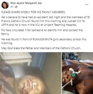 ”He is believed to have had an accident last night and the members of St Francis Catholic Church found him this morning and rushed him to UPTH and he is now in the ICU at Uniport Teaching Hospital.