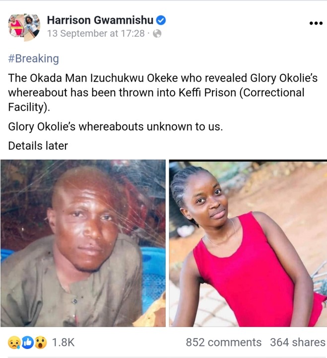 Human rights activist, Harrison Gwamnishu, has taken to his facebook page to report that the Okada man who broke the news of Glory Okolie, Izuchukwu Okeke, has been rearrested in Owerri, Imo state, and dumped in Keffi Prison, Nasarawa State.