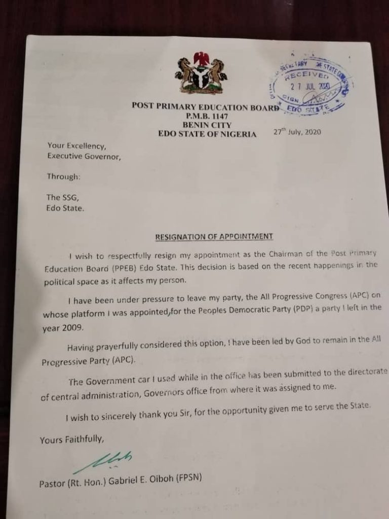 Similarly, the Chairman of the State Post Primary Education Board, Pastor Gabriel Oiboh, in his own resignation letter, also dated 28th July, 2020, stated that he had considered the political happenings in the state as it affects his person, and the pressure to leave the APC, his party to PDP, a party he left since 2009.