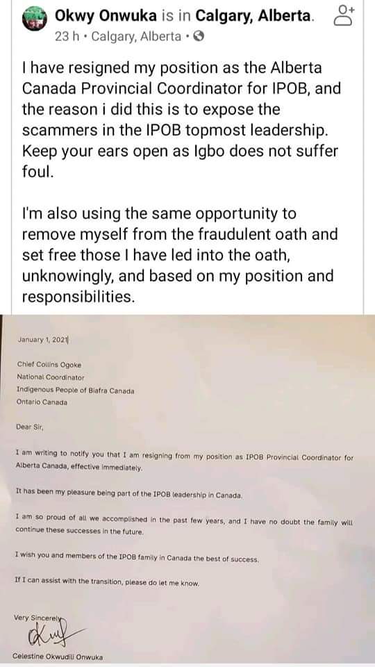 Another IPOB coordinator leaves the fraudulent private enterprise of Nnamdi Usain Bolt Kanu. Read his reasons in his resignation letter