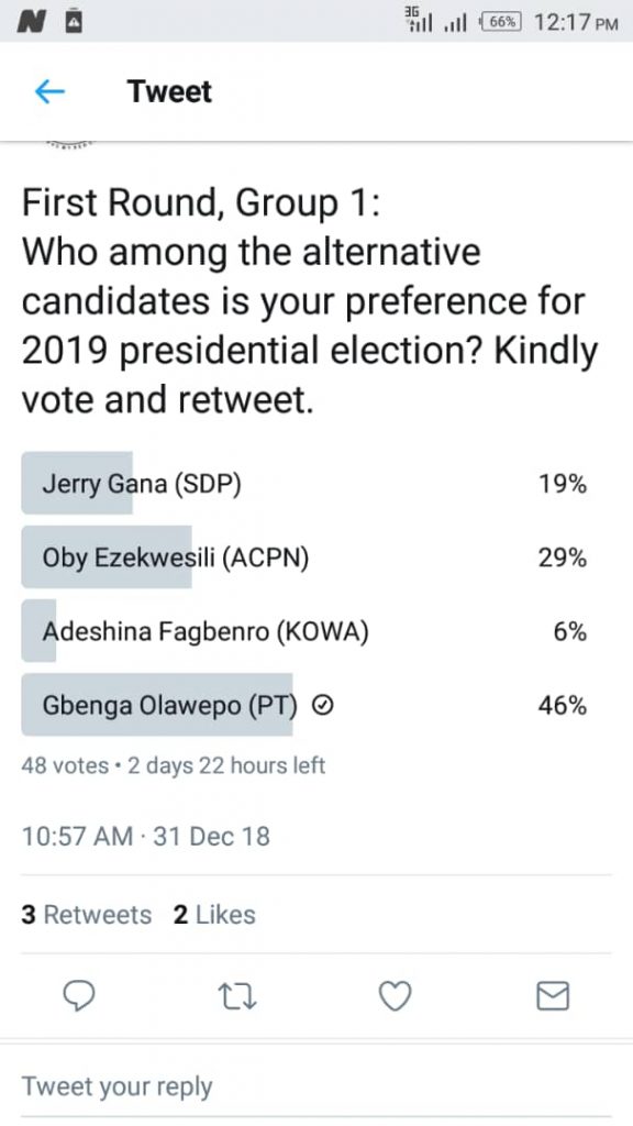 The presidential poll cconducted by the group is trying to identify the most capable alternative presidential candidate to President Muhammadu Buhari of APC and Atiku Abubakar of PDP and People’s Trust Olawepo Hashim is currently leading.