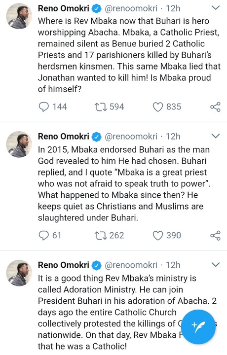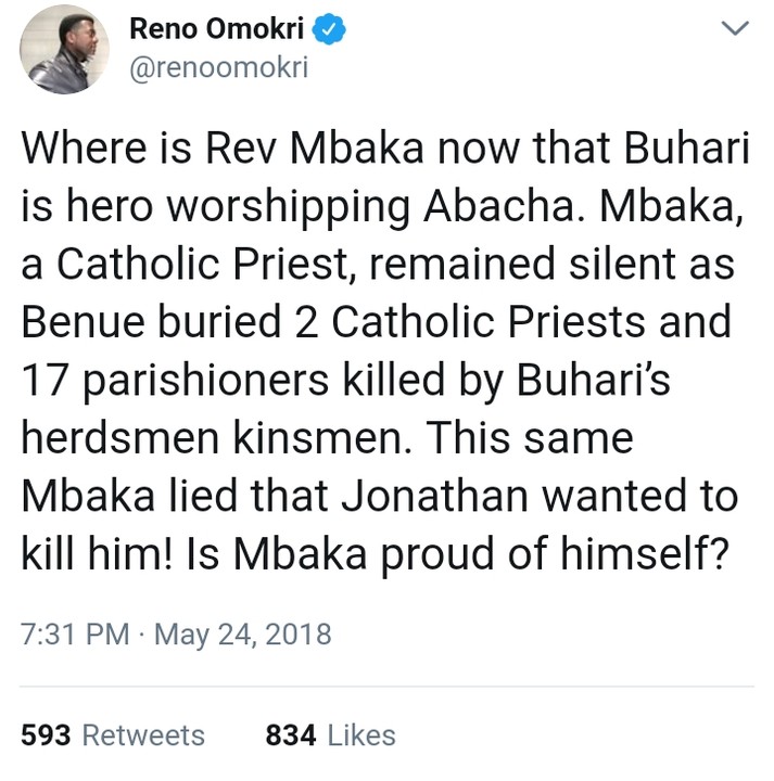 “He can join President Buhari in his adoration of Abacha. 2 days ago the entire Catholic Church collectively protested the killings of Christians nationwide. On that day, Rev Mbaka FORGOT that he was a Catholic!