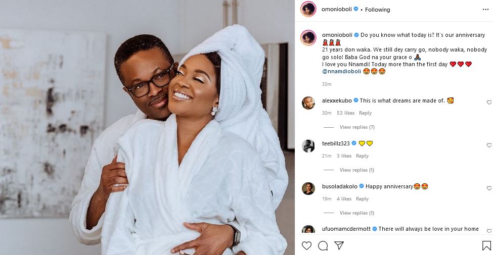 Nigerian actress and filmmaker, Omoni Oboli and her husband, Nnamdi, are celebrating 21 years of marital bliss today, October 28.