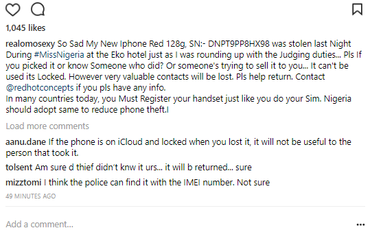 Last Night Actress and mother Omotola Jalade Attended the Miss Nigeria held in Lagos, And just as we are yet to get over her beautiful dress, she just posted a sad news on IG minutes ago that she lost her Iphone 128gb during the event, according to her the Iphone color is red, and that though the thief may not be able to use it cos its locked, but that Valuable contacts are inside