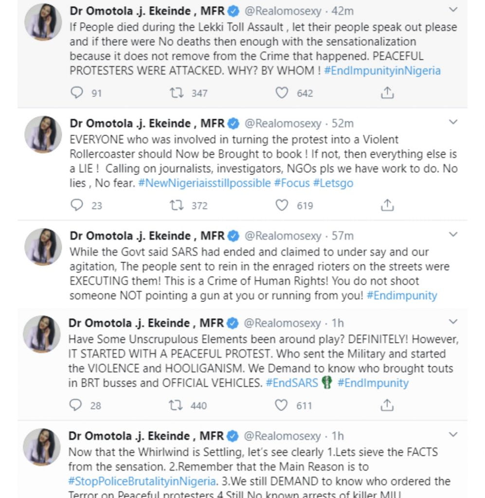 The panel revealed this in the report submitted to the Lagos State Government on Monday. Omotala had urged families of the people who died at the Lekki Tollgate shootings, ‘if there were any’ to come out and speak. She also in the tweet, admonished young people to stop with sensationalizing the killings as it doesn’t remove the crime and would further more instigate chaos. The 43-year-old actress during the Lekki Massacre trends wrote;