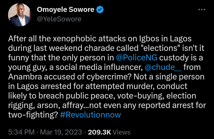 After all the xenophobic attacks on Igbos in Lagos during last weekend charade called “elections” isn’t it funny that the only person in @PoliceNG custody is a young guy, a social media influencer, @chude__ from Anambra accused of cybercrime? Not a single person in Lagos arrested…