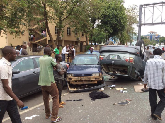One person has been confirmed dead following a crash that occurred moments ago in Area 11 on Ahmadu Bello Road, Abuja. Four vehicles were damaged in the crash and others were injured. See more photos after the cut…