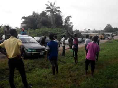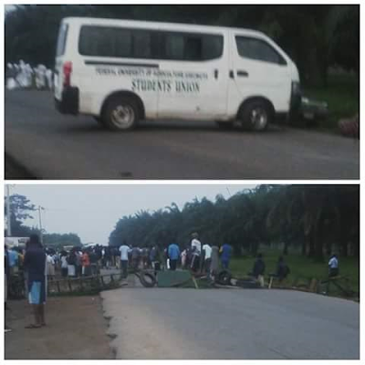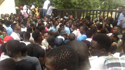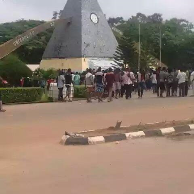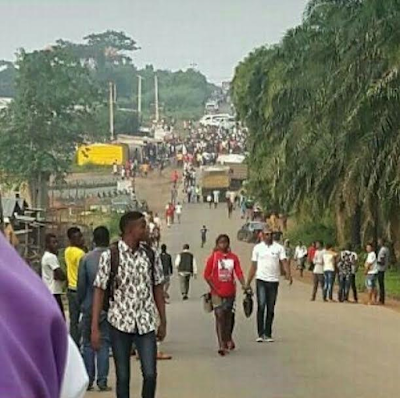 The students were staging a protest over insecurity on campus as some robbers attacked some hostels in the school last night, killing a 100 level Banking and Finance student in the process.